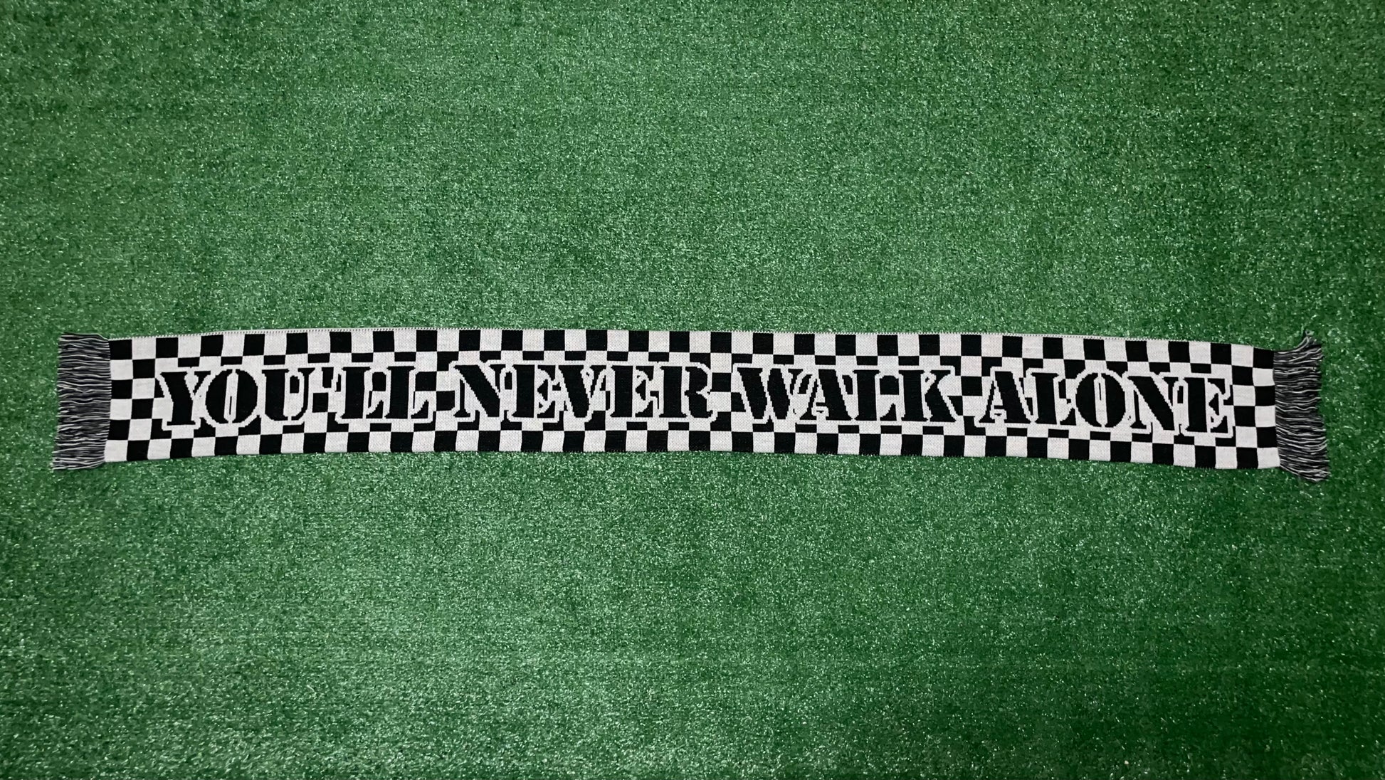 Black & White football scarf with 'You'll Never Walk Alone' on the other side.