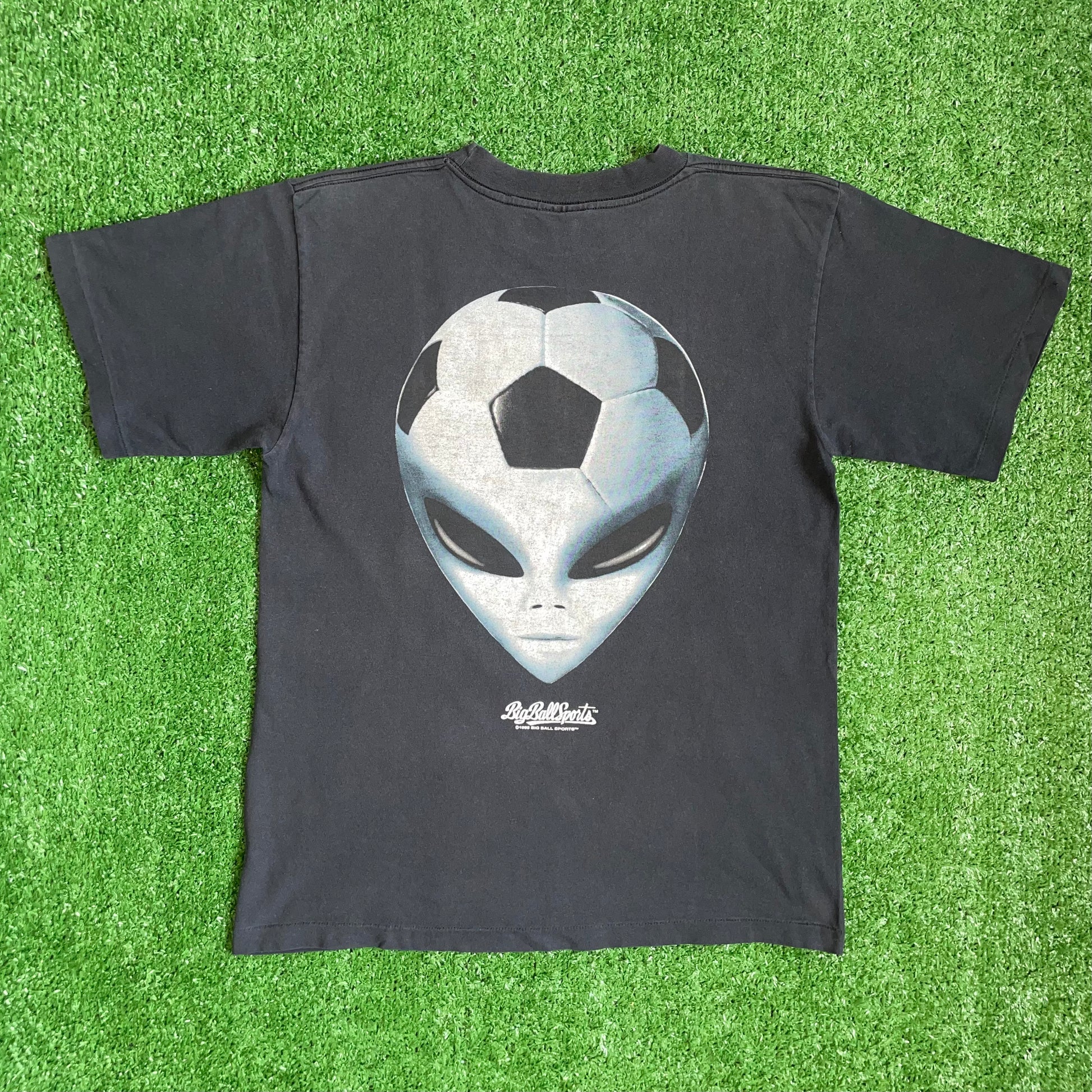 Vintage Big Ball Sports t-shirt with Alien soccer back graphic from 1995.