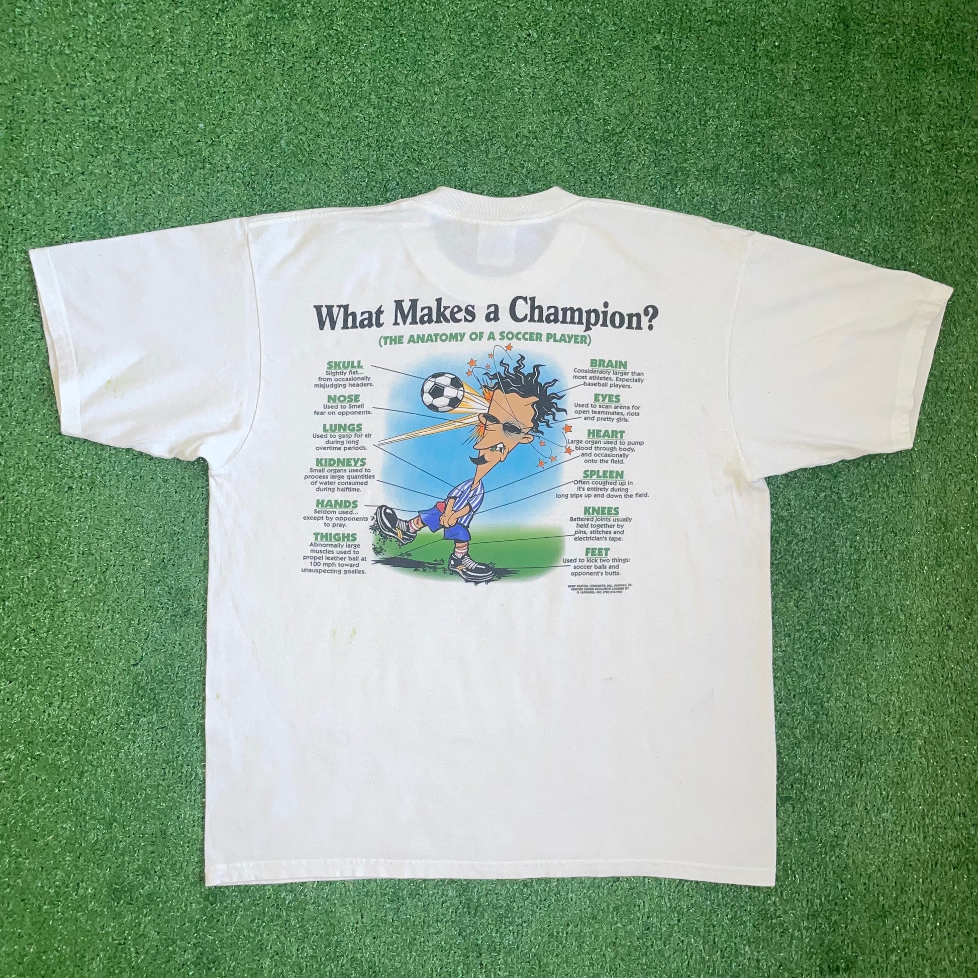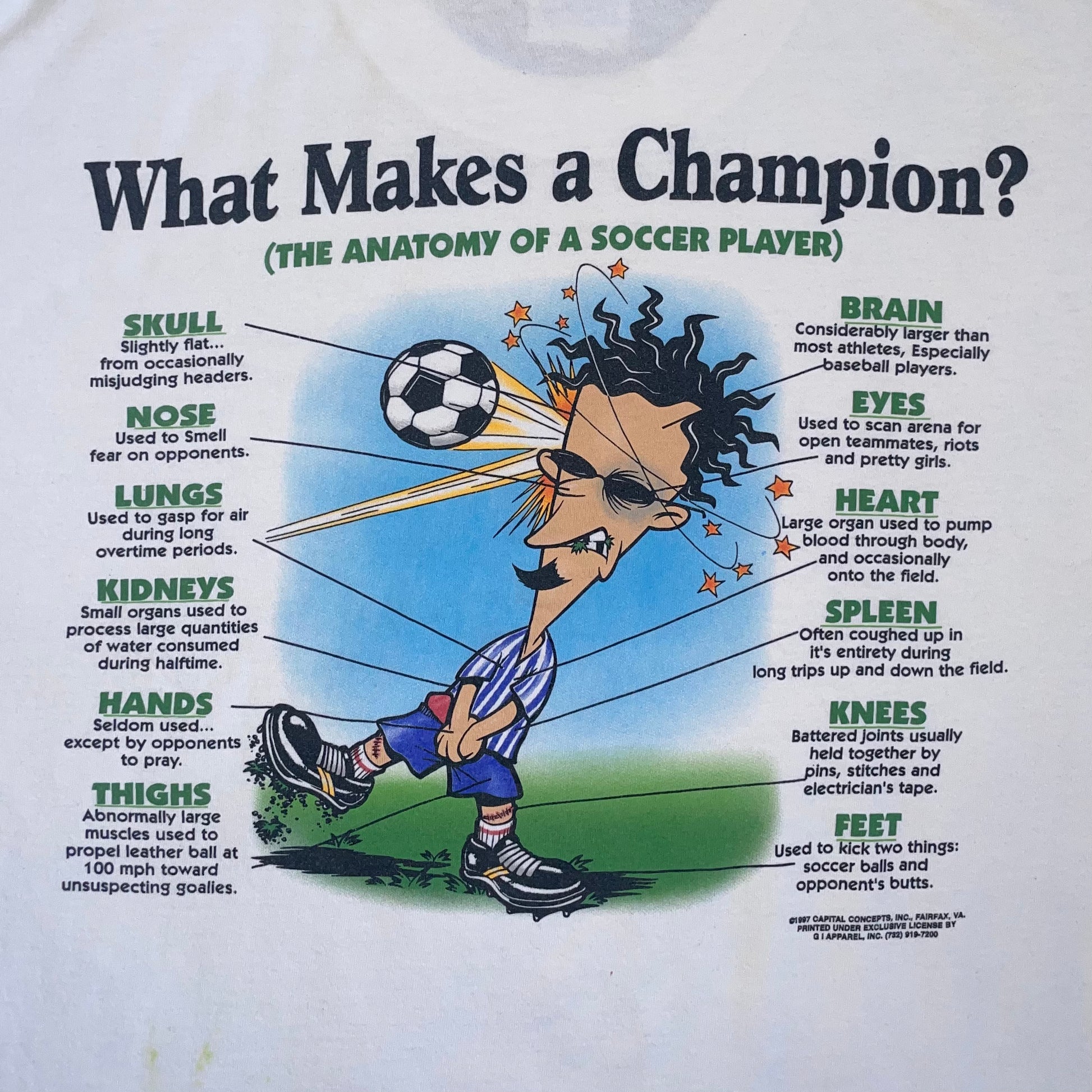 This t-shirt neatly breaks down what is required from a soccer players body to compete at the highest level. For instance - Feet: Used to kick two things; soccer balls & opponent's butts.