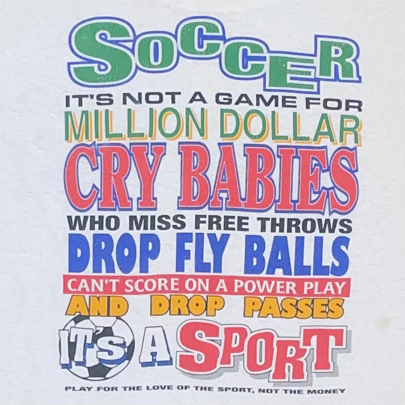 A t-shirt championing soccer's lack of mollycoddled players from a time of innocence before player fits & designer wash bags. Embrace the naivety!